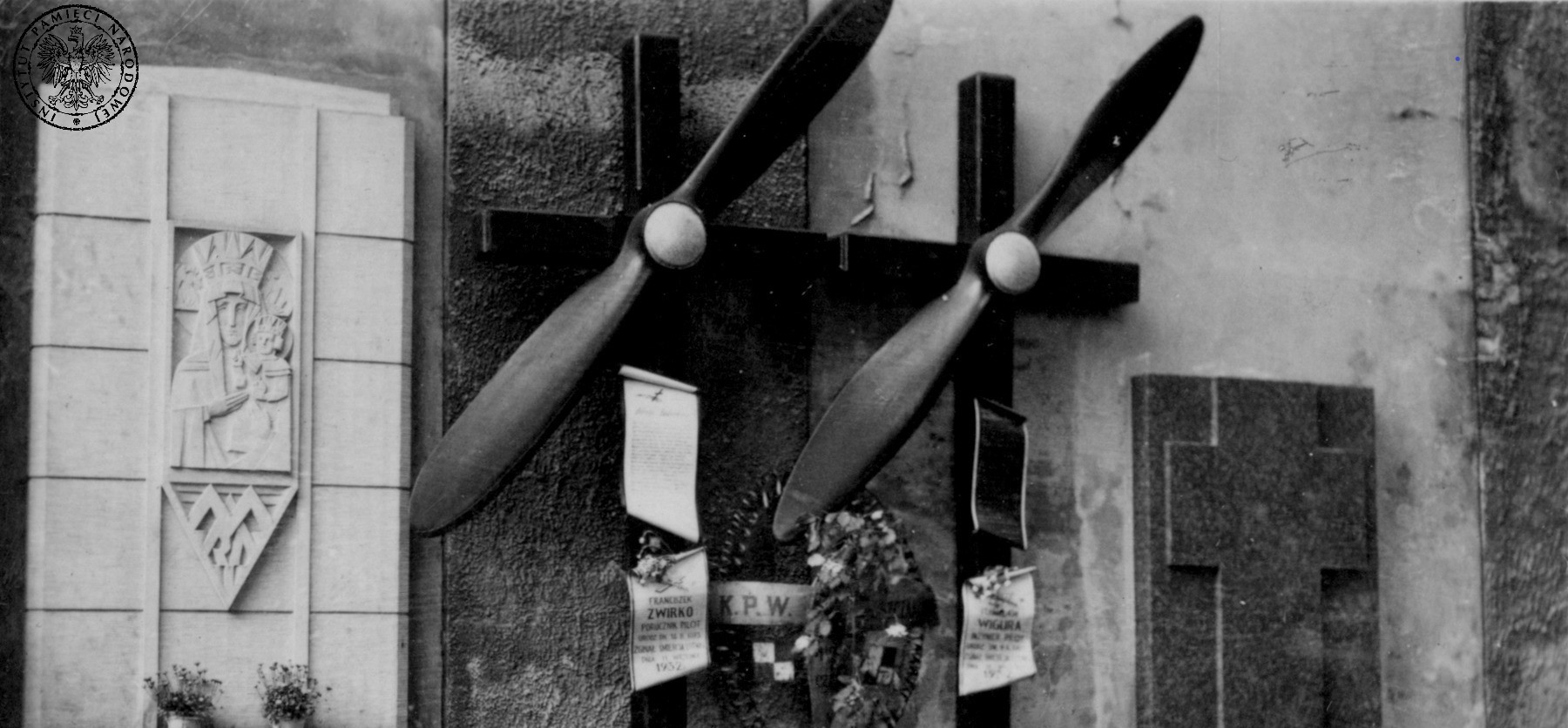 Grób Stanisława Wigury i Franciszka Żwirki na warszawskich Powązkach ze śmigłami przecinającymi ramiona krzyży. Poniżej tablice informujące o tragicznej śmierci w wypadku lotniczym 11 września 1932 r. Z obu stron widoczne inne mogiły, w tym z lewej grobowiec z wizerunkiem Matki Bożej i wykutym poniżej napisem: „Józef Weyssenhoff/Pisarz polski/1860-1932”. Fot. z zasobu IPN (kolekcja: Andrzej Kapłański)
