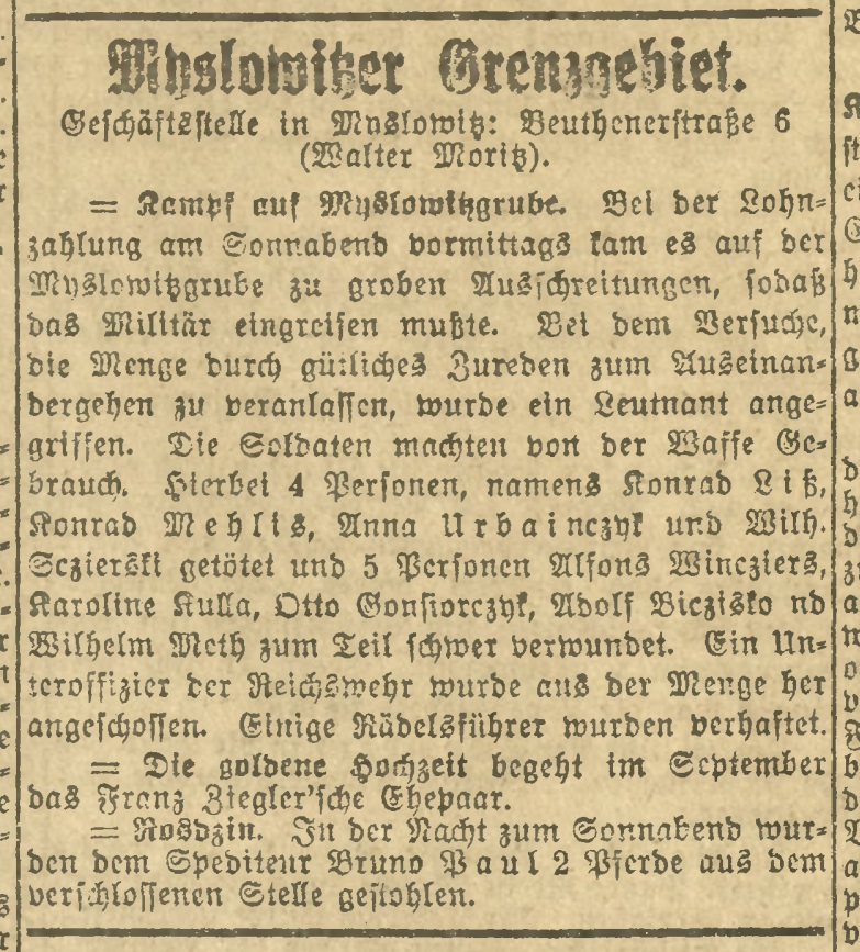 Mniej więcej tak brzmią również personalia ofiar podane przez „Der Oberschlesische Wanderer”. Z jednym wyjątkiem: jako rzekomo czwarty zastrzelony w tym dniu pojawia się tam niejaki Konrad Mehlis, co jest ewidentną pomyłką i powtórzeniem – w wykoślawionej formie – danych personalnych Konrada Lisa vel Liessa. Wedle tej samej gazety pięć osób zostało ciężko rannych, w tym Karolina Kulla, Otto Gonsiorczyk, Adolf Biczysko i Wilhelm Meth. Czy któryś z nich zmarł, wyjaśnić mogłaby dopiero dokładna kwerenda ksiąg zgonów. Do dalszej eskalacji nie doszło. Ogarnięci przerażeniem ludzie rzucili się do ucieczki, a policja i wojsko ruszyło, by wyłapywać mniej lub bardziej rzeczywistych „prowodyrów”.