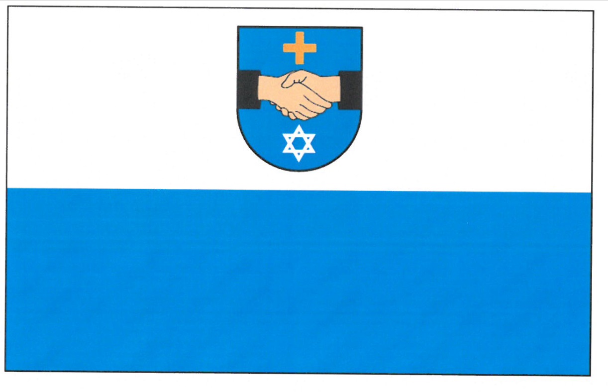 „Ludność żydowska zamieszkiwała w Kolbuszowej od XVII w. Dwa wieki później stanowiła już połowę jej mieszkańców. O poprawnych relacjach między dwiema narodowościami żyjącymi w tym podkarpackim mieście miał świadczyć jego herb – dwie uściśnięte dłonie, a obok nich krzyż równoramienny i gwiazda Dawida”. Fot. Flaga Gminy Kolbuszowa ze współczesną wersją herbu.