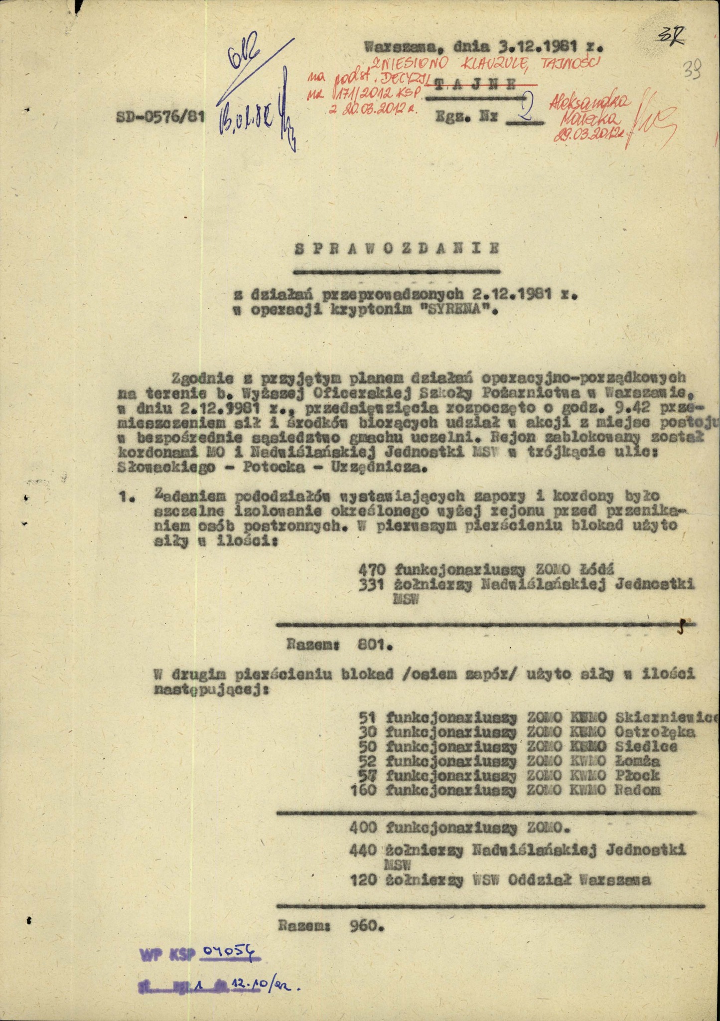 Sprawozdanie Wydziału Wojewódzkiego Stanowiska Kierowania KS MO z operacji krypt. „Syrena” – pacyfikacji strajku w WOSP 2 grudnia 1981 r. (druga strona). W dokumencie mowa jest m.in. o desancie grupy szturmowej na dachy uczelni z helikoptera i zatrzymaniu przez milicję 35 osób. Warszawa, 3 grudnia 1981 r. (z zasobu AIPN)