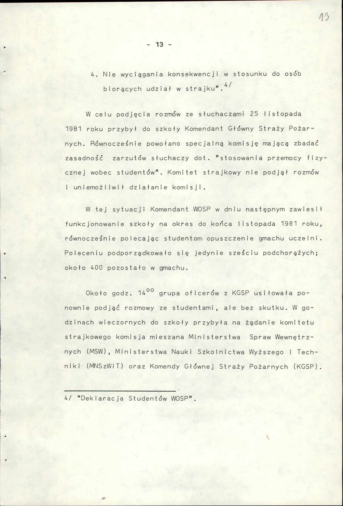 Fragment pracy magisterskiej ppor. Krzysztofa Dybca z Akademii Spraw Wewnętrznych pt. „Odblokowywanie nielegalnie zajętych obiektów na przykładzie Wyższej Oficerskiej Szkoły Pożarniczej w Warszawie”. W dokumencie jest mowa m.in. o okolicznościach rozpoczęcia strajku w WOSP 25 listopada 1981 r. oraz o zawieszeniu funkcjonowania uczelni przez jej komendanta następnego dnia. Warszawa, 1988 r. (z zasobu AIPN)