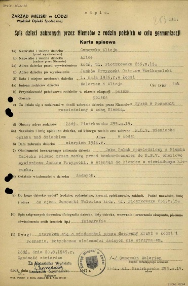 Pilną kwestią było odzyskanie dzieci polskich „zrabowanych” na skutek germanizacyjnej polityki okupanta. W lipcu 1945 r. urzędy wojewódzkie na terenie Polski otrzymały pismo w sprawie sporządzenia spisu dzieci wywiezionych na tereny III Rzeszy. Szacuje się, że w czasie wojny wywieziono ok. 200 tys. dzieci, jednak liczba ta może być znacznie wyższa.