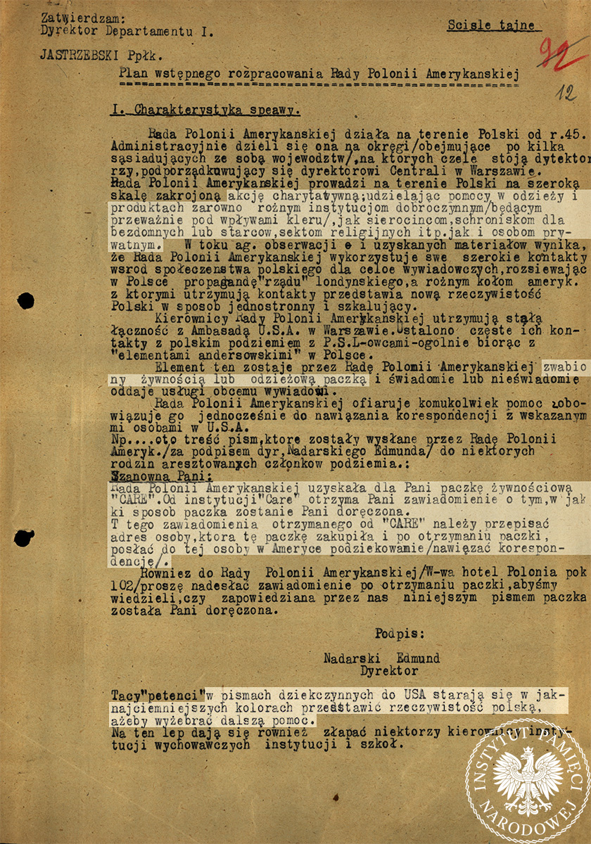 The communist Security Office, using the foreign intelligence cells, also gathered information on the Polish diaspora organisations cooperating with CARE, i.e. the Polish War Relief.