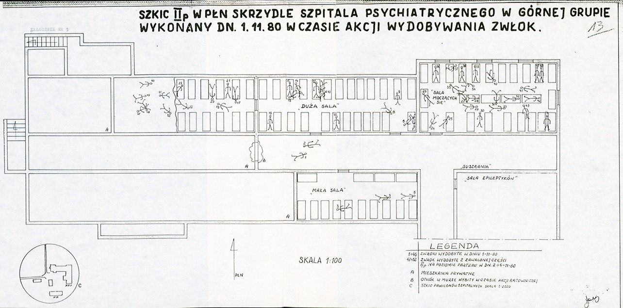 Sketch of the second floor in the northern wing of the Hospital for the Mentally and Psychologically Ill in Górna Grupa., drawn during the operation of extracting bodies after the fire, November 1, 1980. Drawing comes from Wiesław Biesek's master's thesis entitled “Organisation of protective and orderly activities of the Voivodeship Emergency Medical Services in Bydgoszcz during catastrophes and natural disasters on the example of the fire in the psychiatric hospital in Górna Grupa”