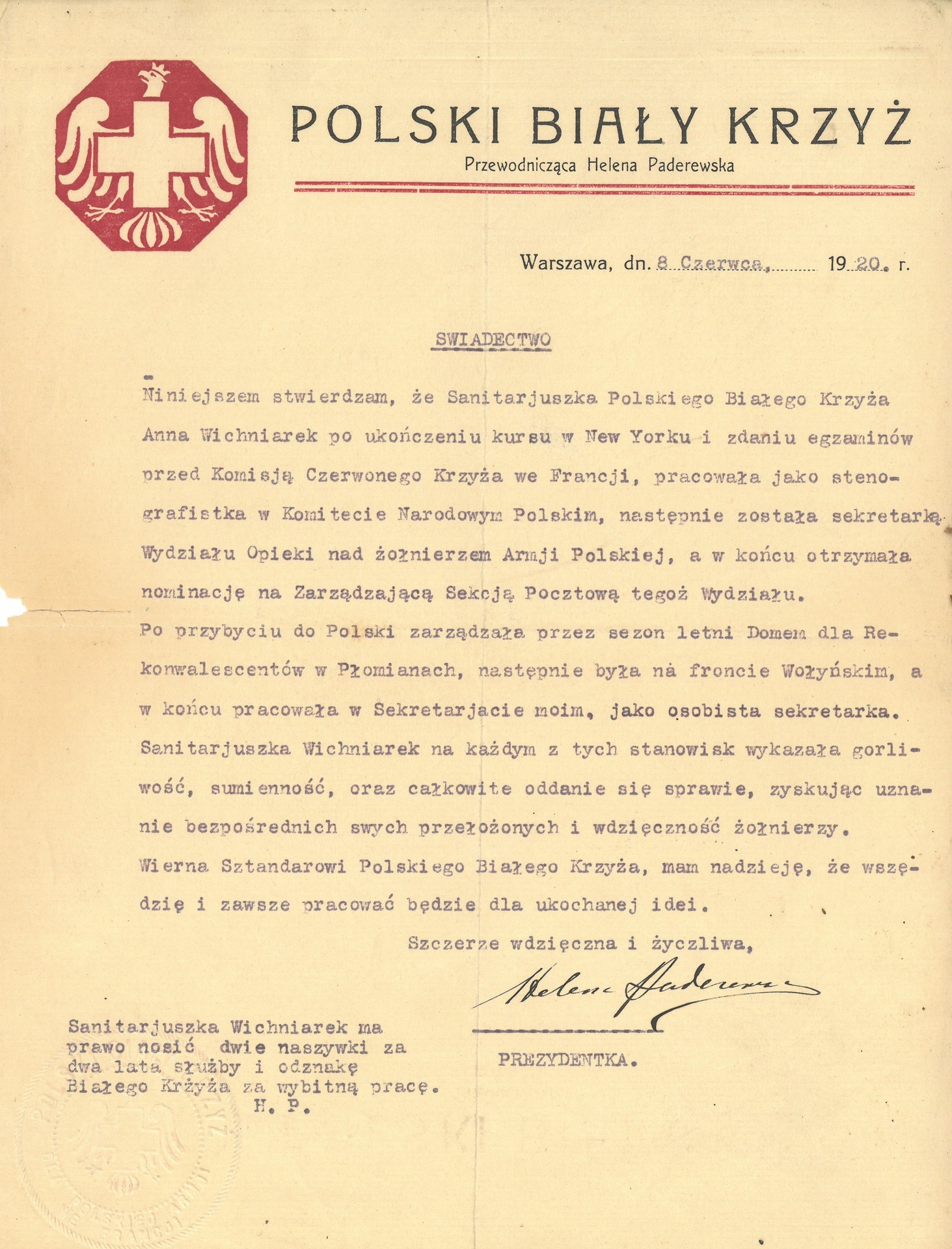 In February 1919, the Polish White Cross moved to Poland which was closely connected with Ignacy Jan Paderewski taking the offices of Prime Minister and Minister of Foreign Affairs. The organisation played a crucial role during the 1919-1920 Polish-Soviet war, when it expanded its broad charity work. One of its major achievements was organising an ambulance train for wounded soldiers and a freight train for getting supplies like food, clothing and cigarettes to the back of the front line.