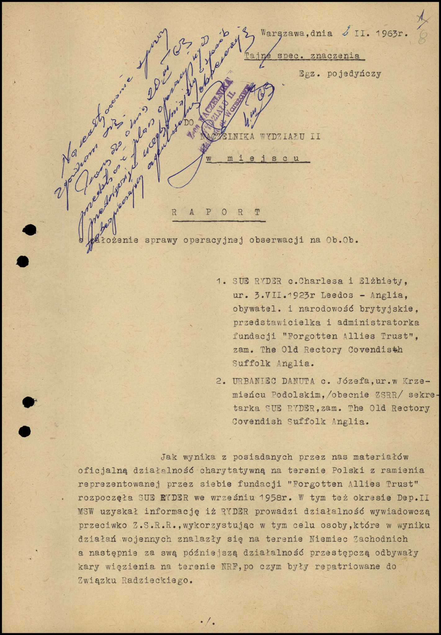 Report: motion to establish an operational surveillance case codenamed “Filantropki” concerning Sue Ryder and her secretary Danuta Urbaniec (front page). Warsaw, February 2[?], 1963 (photo from the Archives of the Institute of National Remembrance)