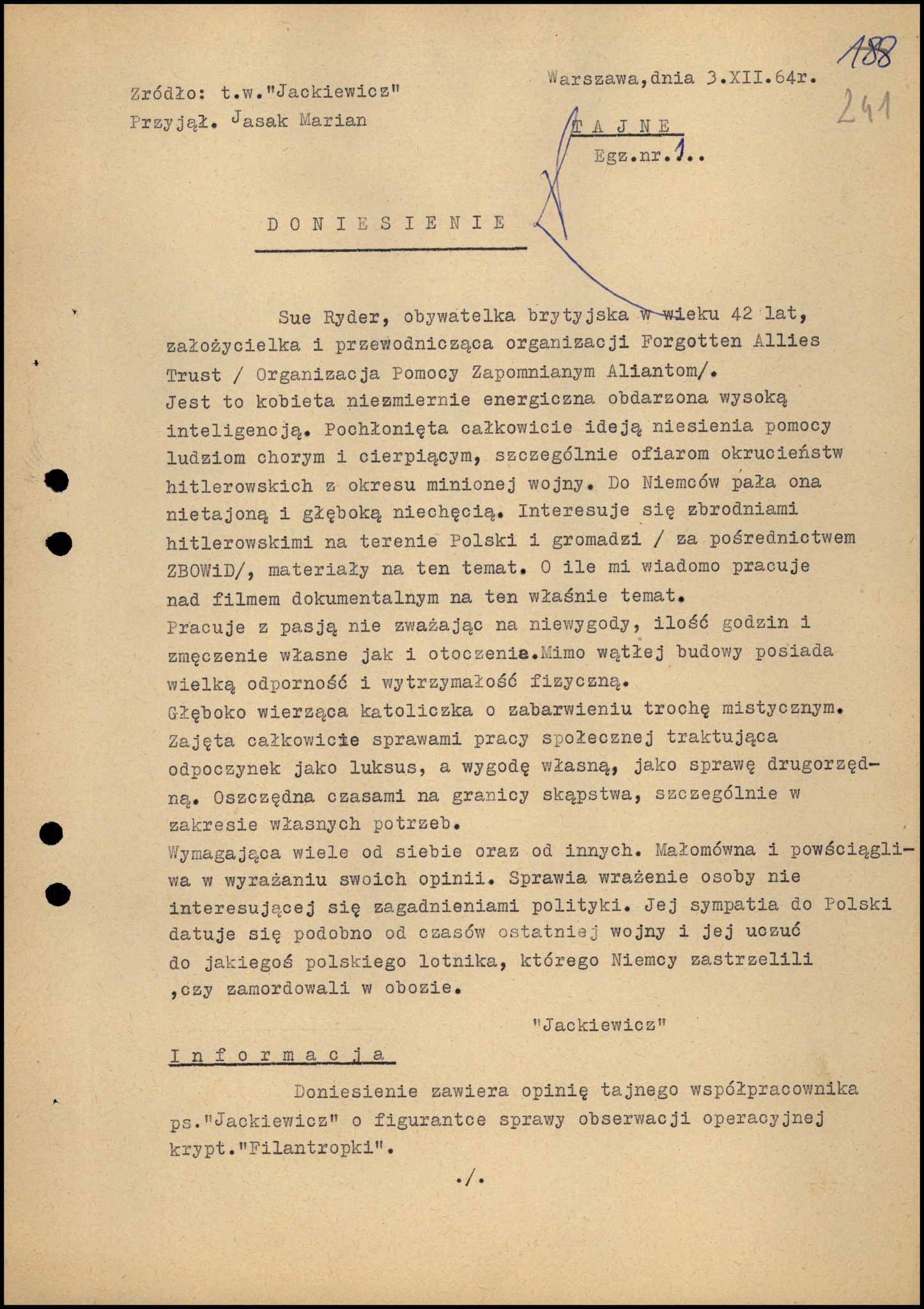 An agent's report by a secret collaborator codename “Jackiewicz,” containing a description of Sue Ryder. Warsaw, December 3, 1964. The first part says: “it’s a woman of great energy and high intelligence. She is completely focused on her mission of bringing aid to the ill and suffering, especially the victims of the Nazi terror.” (photo from the Archives of the Institute of National Remembrance)