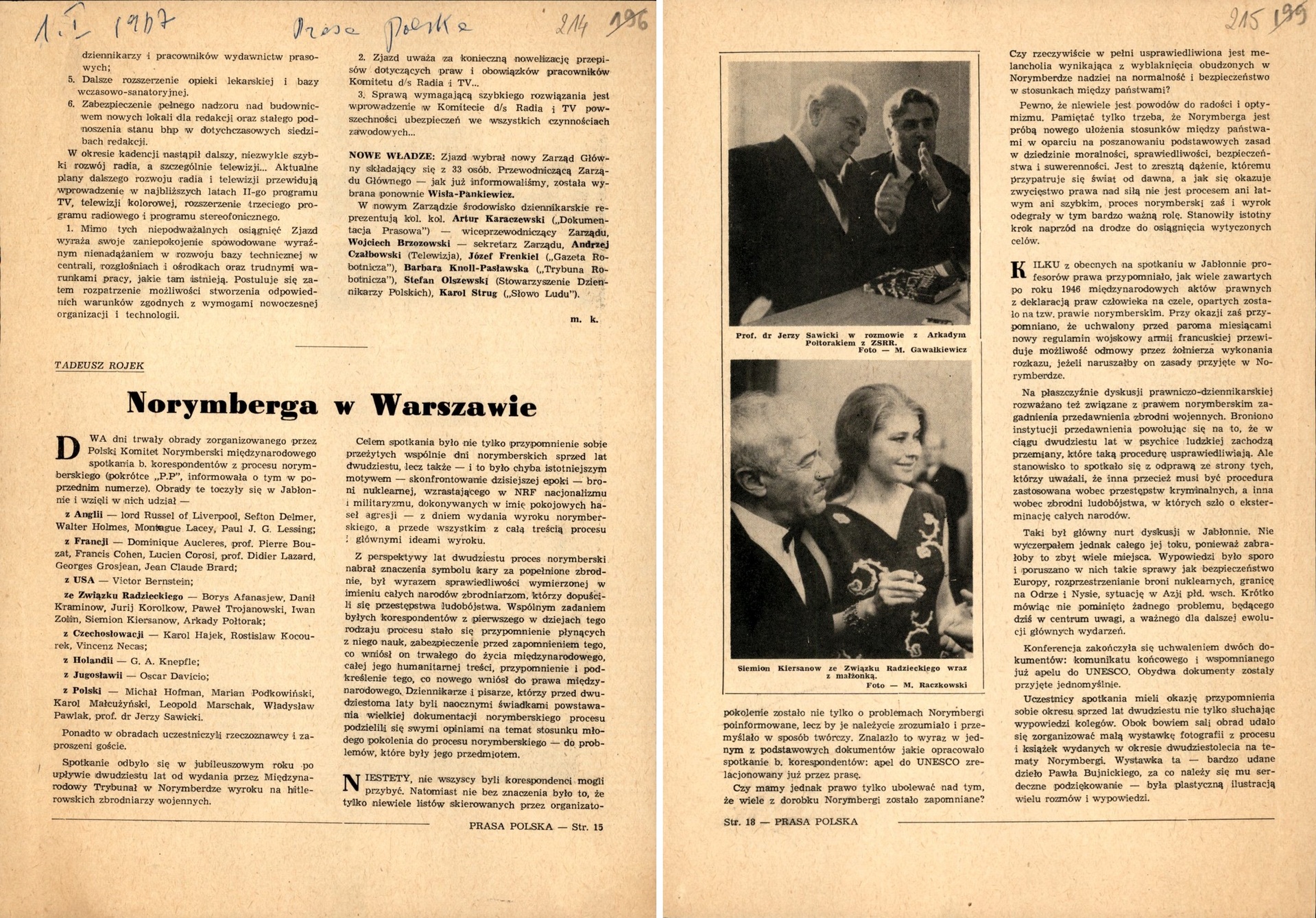 Although the meeting of former correspondents was social in nature, it was also driven by serious issues. As Karol Małcużyński said at the opening session, its goal was “not only to share memories from 20 years ago,” but also “the need to recall, in the age of nuclear weapons, the achievements of the Nuremberg Trials, (…) to recall the lessons learned from the trial, to protect from oblivion its lasting contribution to international life.” This was important, he noted, because neo-fascist movements were resurfacing in Germany, the status quo in Europe was getting undermined, attempts were being made to forgive and erase the Nuremberg Trials, to question historical documentation, and to cut off the younger generations from historical truth.