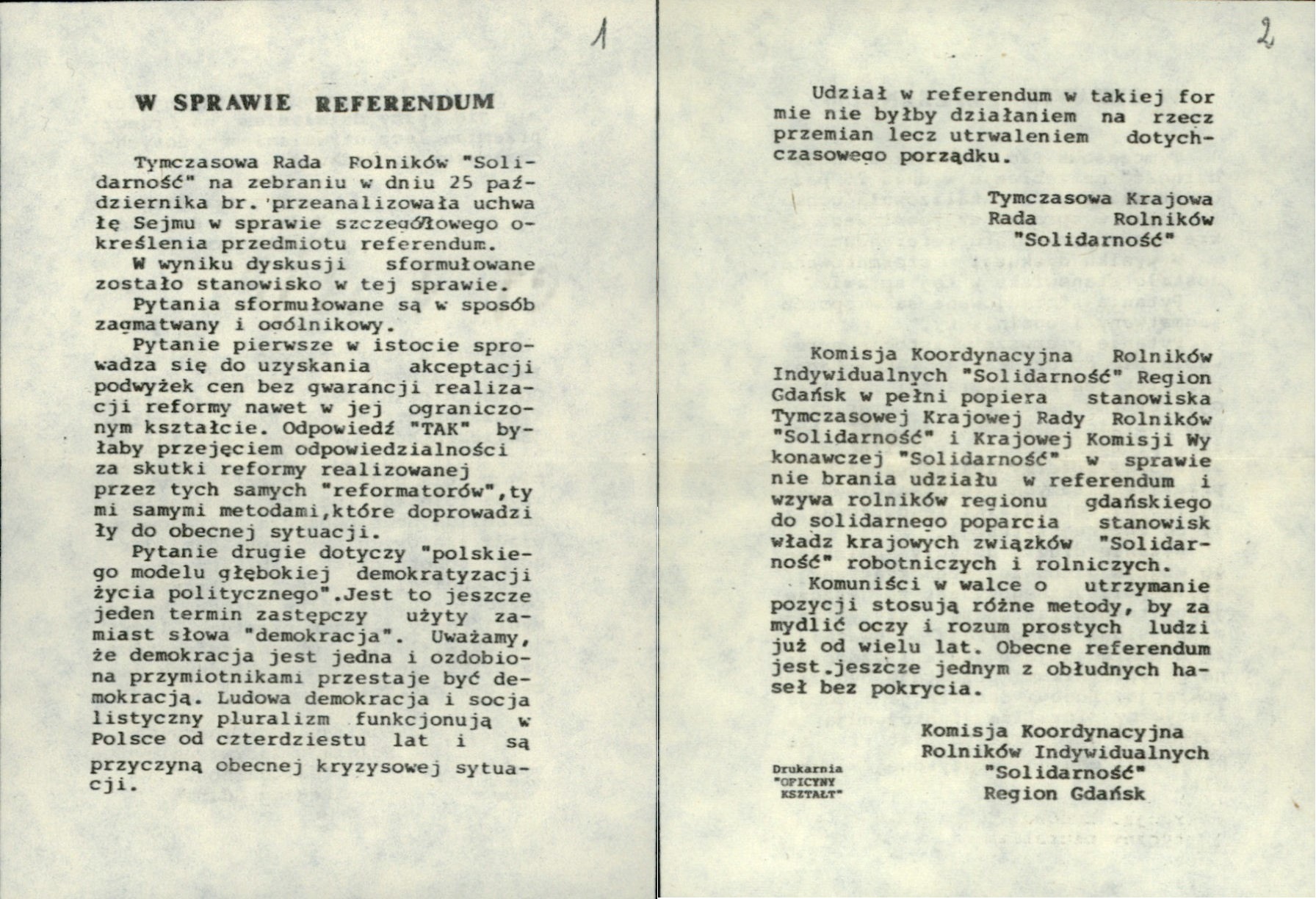 Leaflet with the position of the Provisional National Council of Farmers Solidarity and the Coordination Commission of Individual Farmers Solidarity Gdańsk Region concerning the referendum. From the collections of the Institute of National Remembrance (from the collection of Bożena Malinowska)