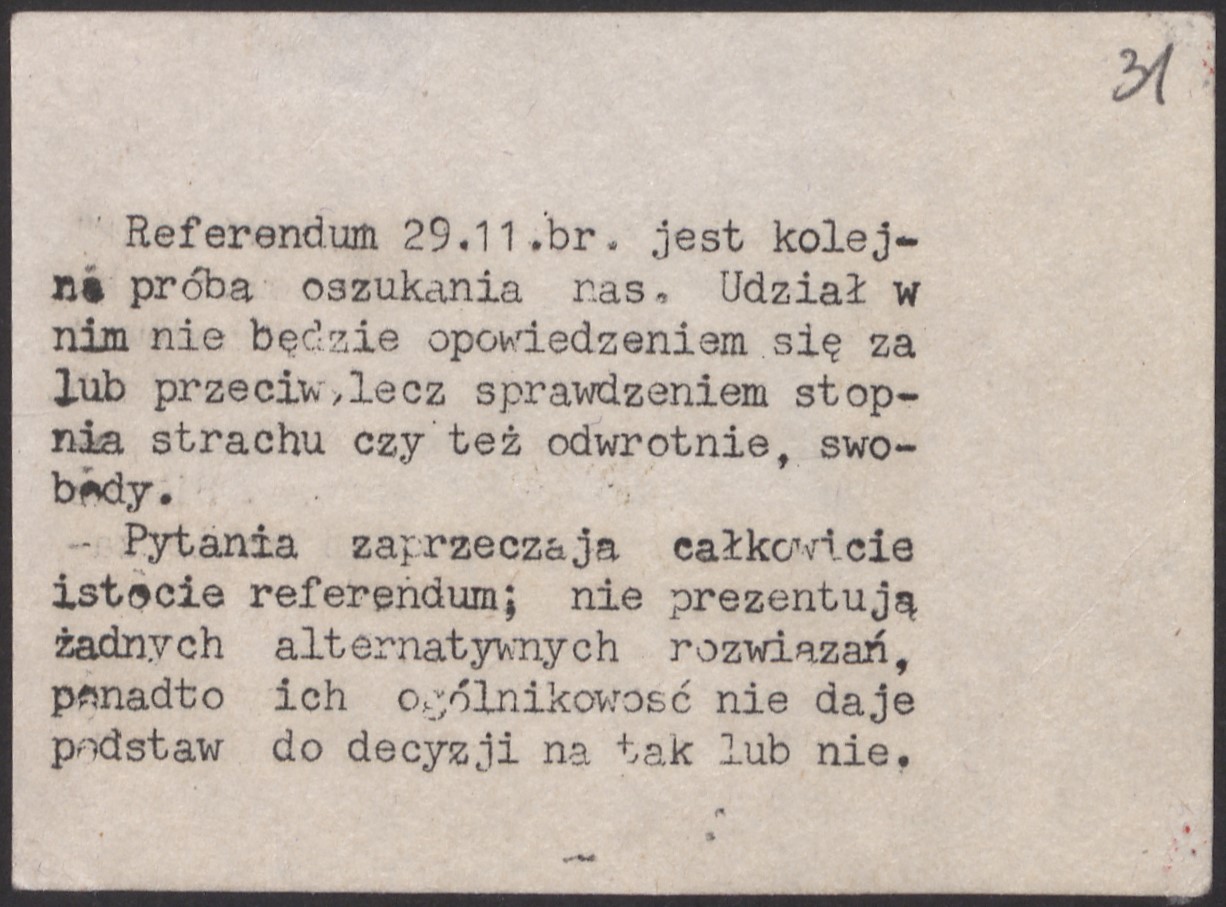 From the operational materials of the Ministry of Internal Affairs of the Polish People's Republic collected as part of the case codename “Forum” (concerning the operational security of the preparations and conduct of the referendum on November 29, 1987). From the collections of the Institute of National Remembrance