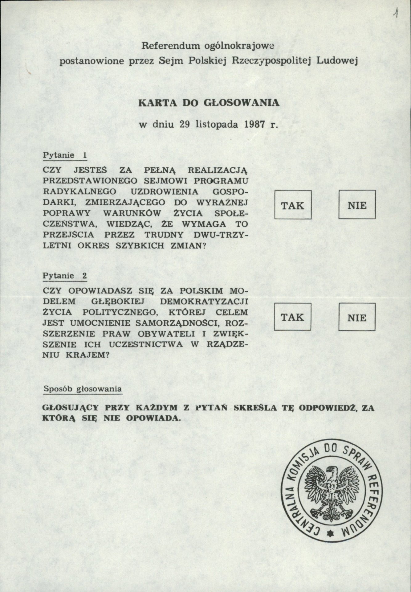 “1. Are you in favour of the full implementation of the program presented to the Sejm [lower house of parliament] on the radical recovery of the economy, leading to the clear improvement of living standards, knowing that it would require going through a difficult, two to three-year period of swift changes?;