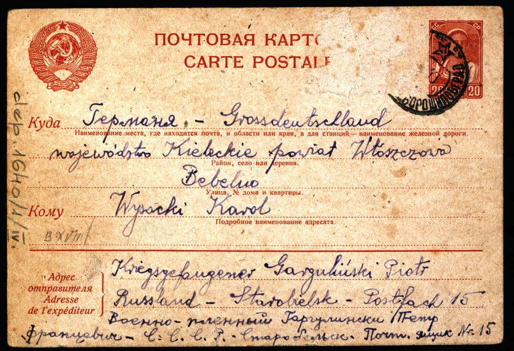 W pierwszych listach przesłanych pod koniec listopada 1939 r. jeńcy informowali bliskich o swym pobycie na terenie ZSRS. Prosili o szybką i zwięzłą odpowiedź, zawierającą tylko najważniejsze informacje. Przykładem może być list z 3 marca 1940 r. przesłany do rodziny przez jeńca Starobielska ppor. Piotra Gargulińskiego:
