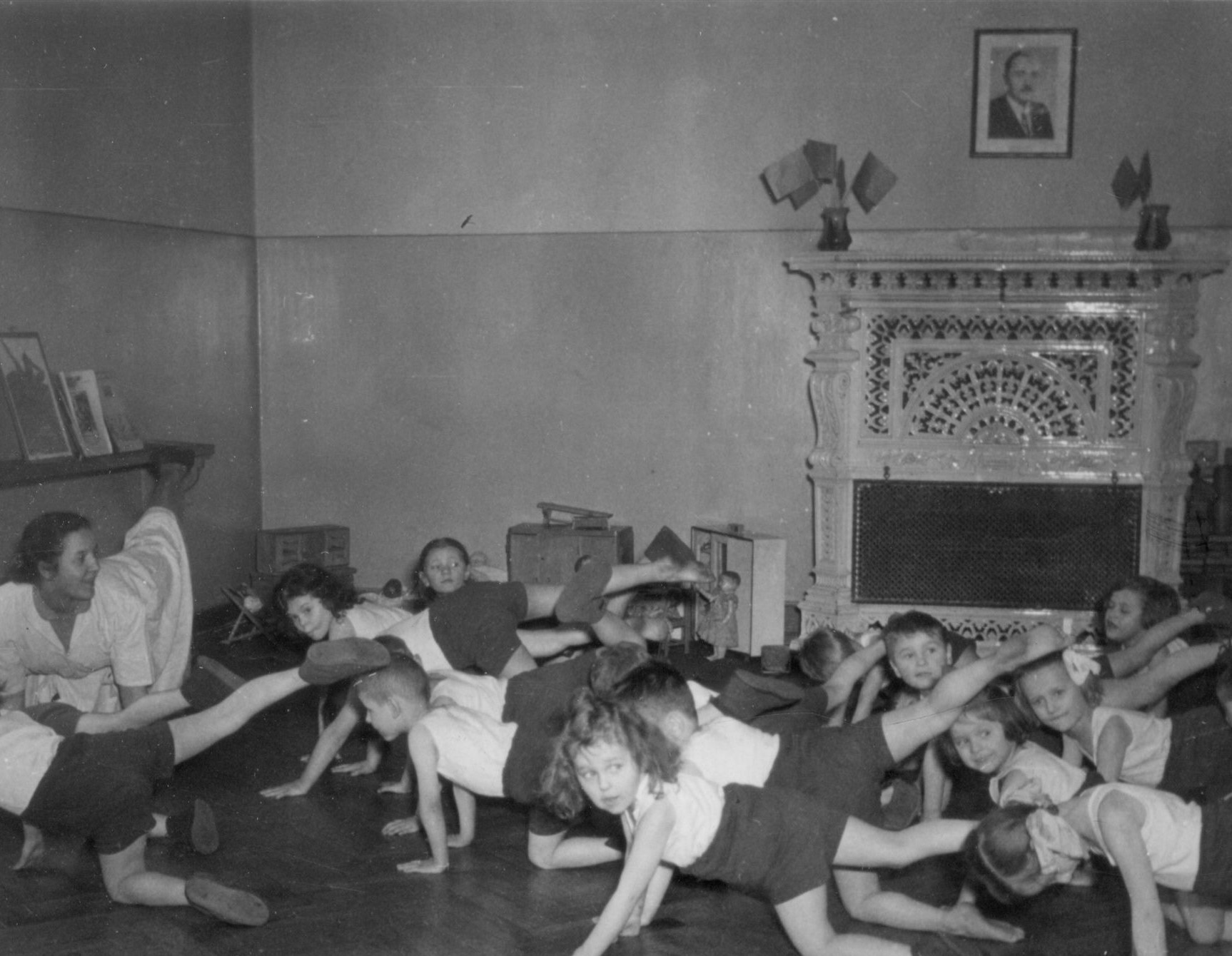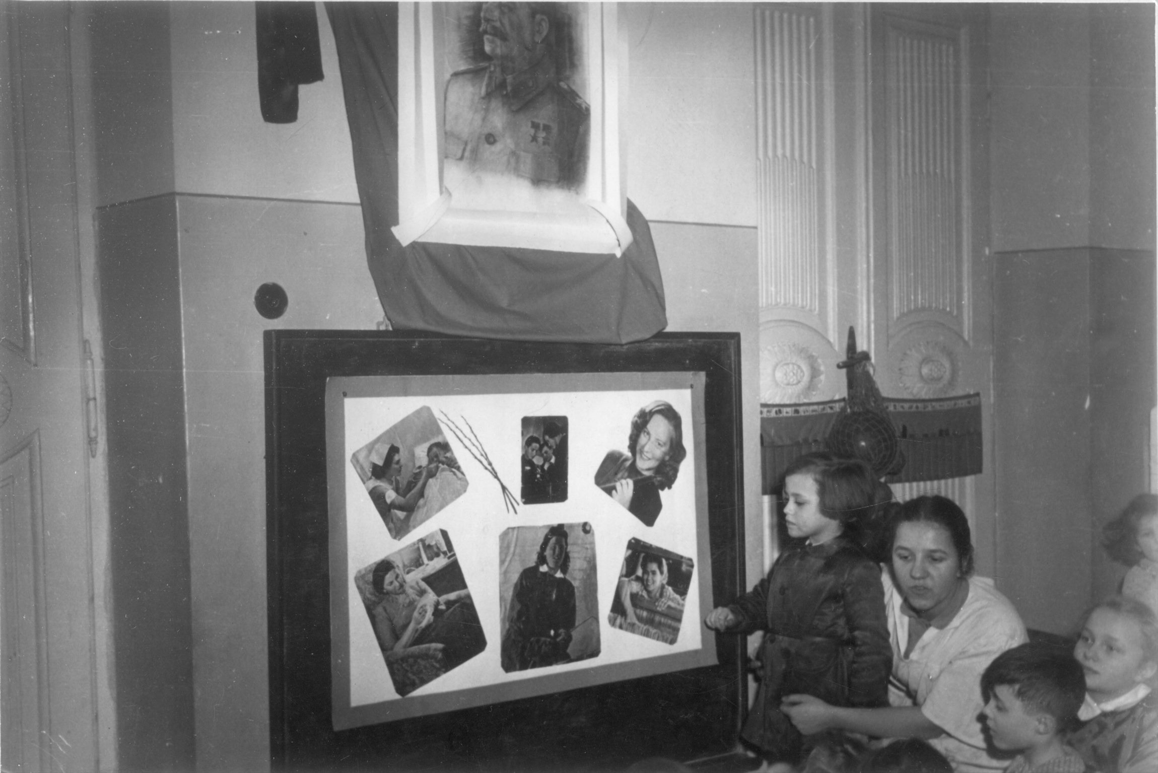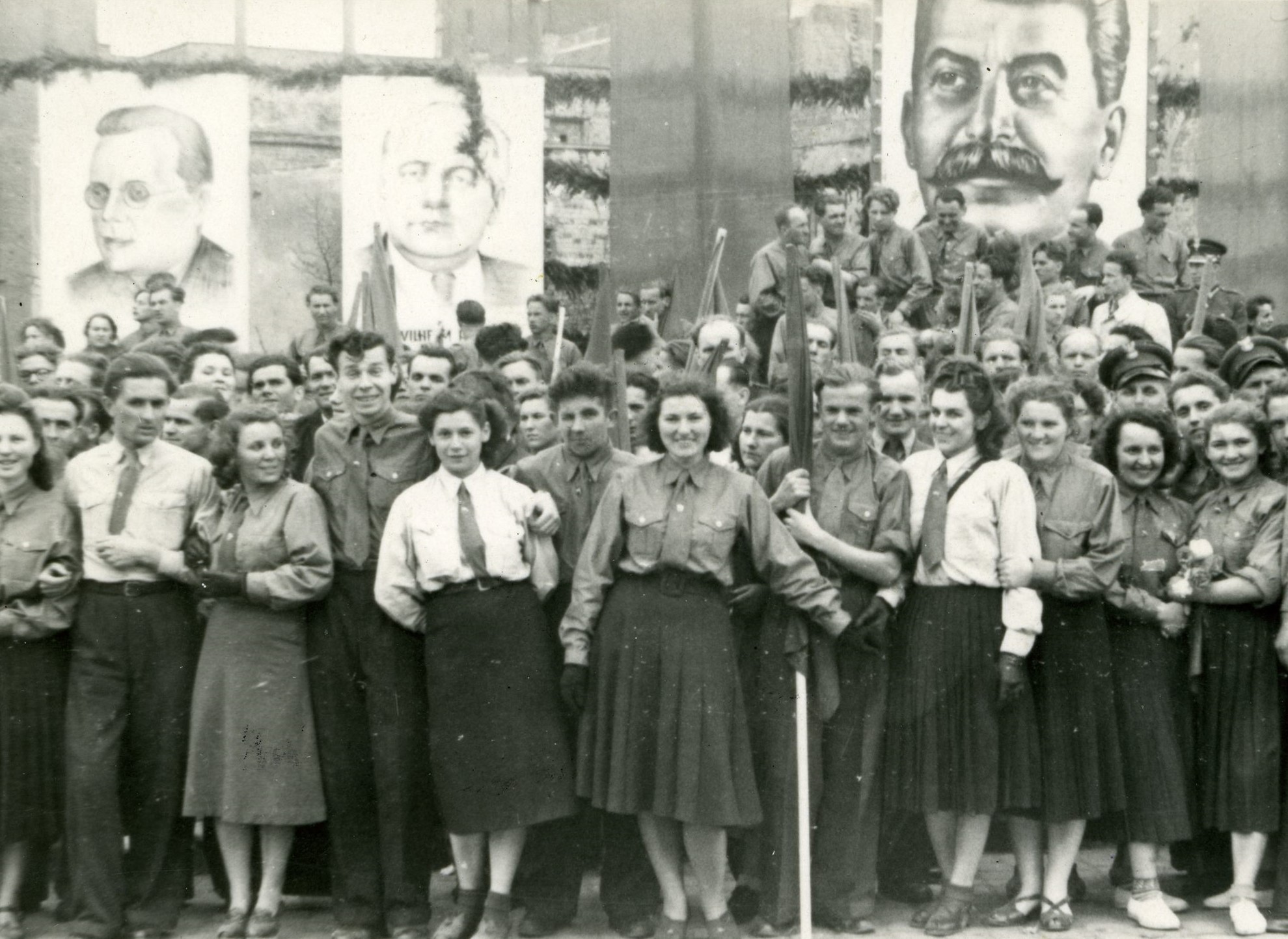 Członkowie ZMP prawdopodobnie przed pochodem 1 Maja w Gdańsku w okresie Polski Ludowej. W tle widoczny portret Józefa Stalina (fot. z zasobu IPN)