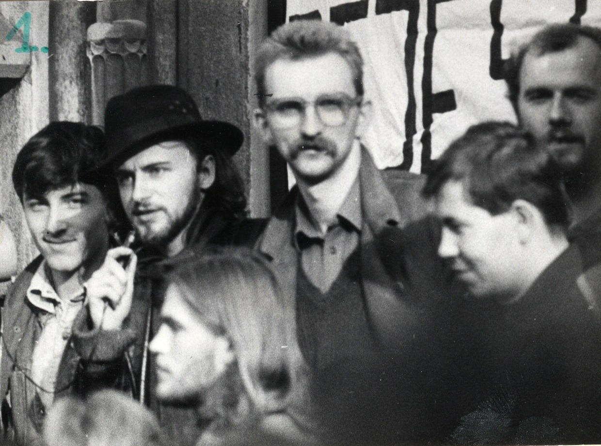 Wiec na Rynku Głównym w Krakowie w dniu 16 V 1989 r. pod hasłem „Sowieci do domu”. Od lewej stoją: J. Skoczylas (niezależny dziennikarz) J. Rojek, M. Gryczmańska (z tubą), Z. Przytuła (w środku, trzyma transparenty) R. Huget (przemawia), R. Młynarczyk (na stopniach pomnika, w długich włosach, trzyma transparent) (fot. AIPN)