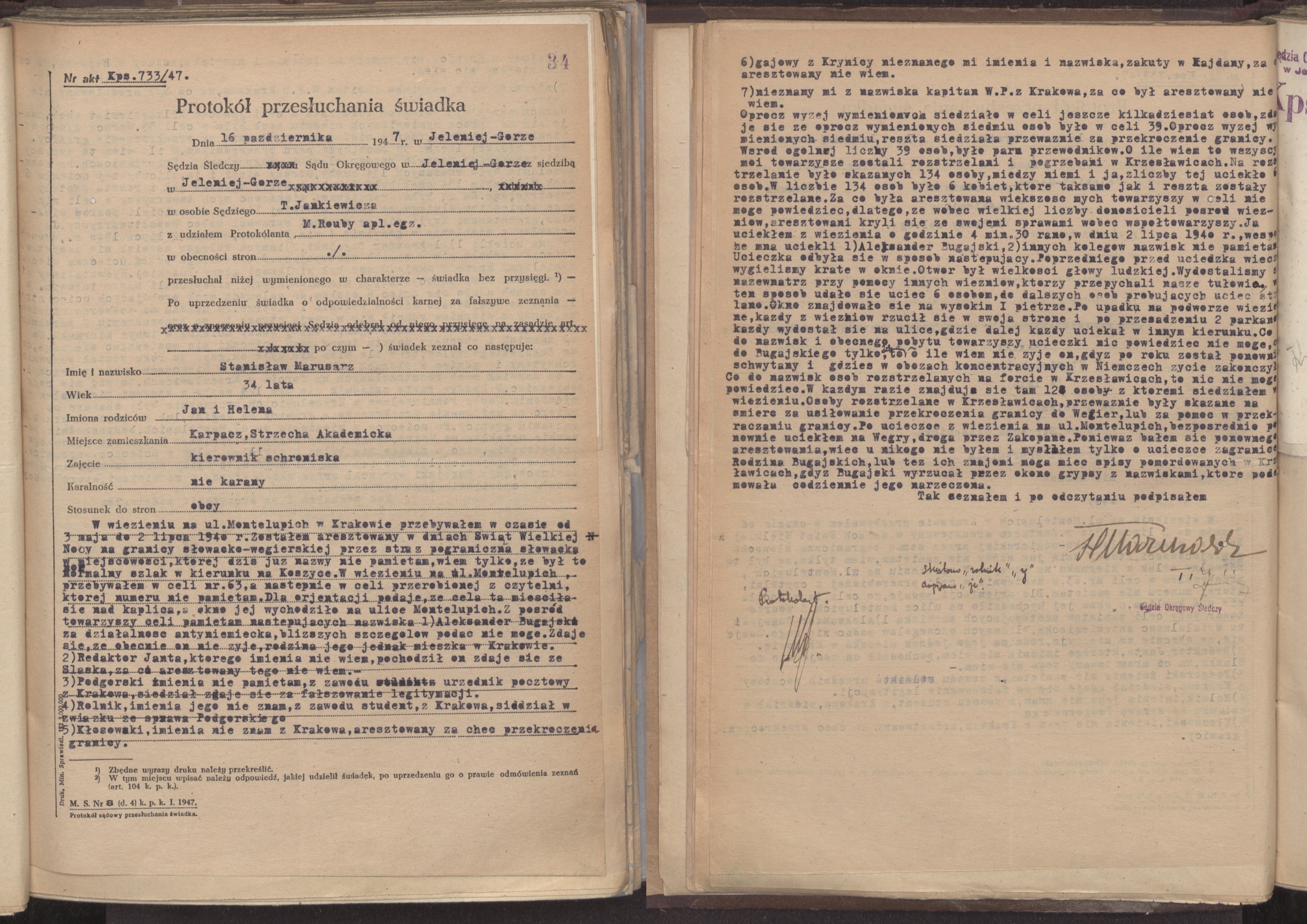 Zeznanie Stanisława Marusarza złożone 16 października 1947 r. przed sędzią śledczym Sądu Okręgowego w Jeleniej Górze. Dokument pochodzi z akt wytworzonych przez Okręgową Komisję Badania Zbrodni Niemieckich w Krakowie w sprawie Josefa Bühlera, sekretarza stanu i szefa rządu Generalnego Gubernatorstwa, sądzonego przez Najwyższym Trybunałem Narodowym i skazanego na karę śmierci w 1948 r. (z zasobu AIPN)