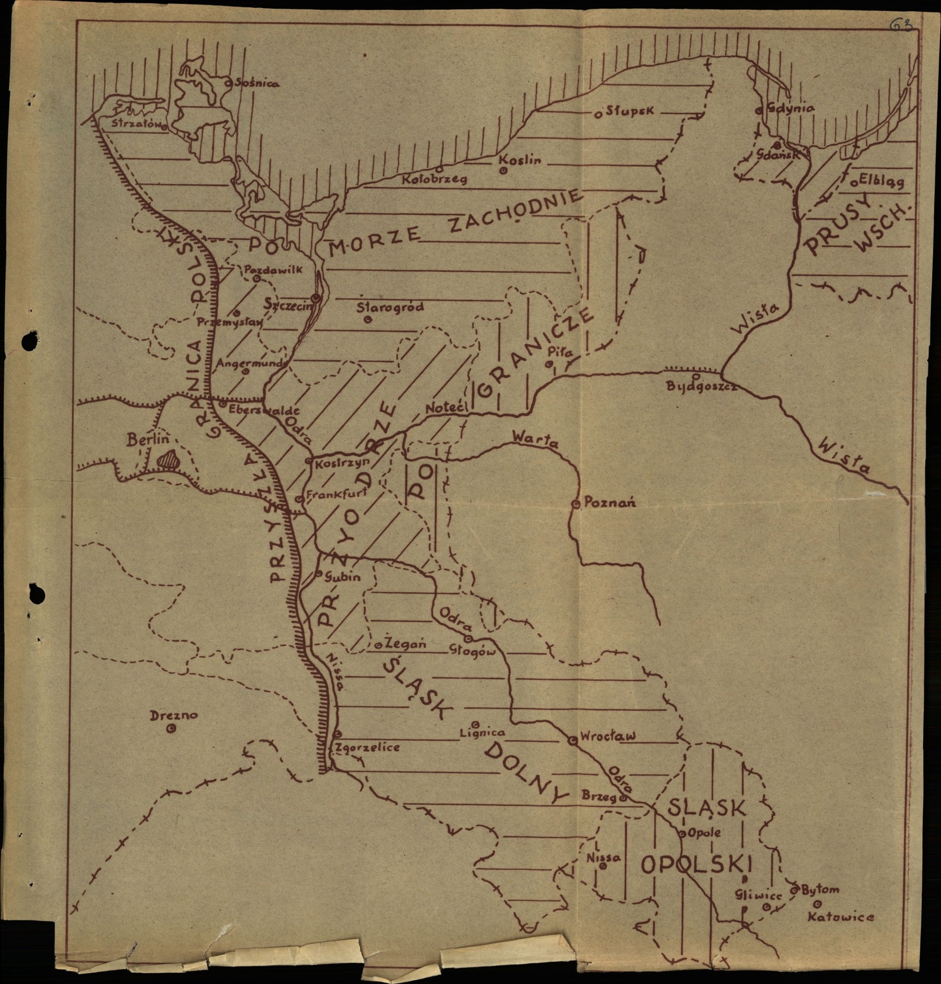 Mapa stanowiąca załącznik do wydanej konspiracyjnie w 1941 r. pracy Lecha Neymana „Szaniec Bolesławów”, przedstawiająca postulowaną w okresie II wojny światowej przez polski obóz narodowy powojenną zachodnią granicę Polski (z zasobu AIPN)