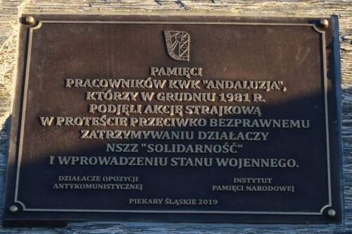 Przed Ośrodkiem Kultury Andaluzja w Piekarach Śląskich, przy ul. Oświęcimskiej 45, odbędzie się uroczyste odsłonięcie tablicy upamiętniającej górników KWK „Andaluzja”, którzy podjęli akcję strajkową w proteście przeciwko bezprawnemu zatrzymaniu działaczy NSZZ „Solidarność“ i wprowadzeniu stanu wojennego. Po odsłonięciu tablicy dalsza część uroczystości będzie mieć miejsce w Ośrodku Kultury Andaluzja. Na upamiętnienie zapraszają dyrektor Oddziału Instytutu Pamięci Narodowej w Katowicach dr Andrzej Sznajder, Prezydent Miasta Piekary Śląskie Sława Umińska-Duraj oraz prezes Niezłomnych Niepokornych Działaczy Antykomunistycznych Represjonowanych 1956-1989 Stanisław Brzeźniak.