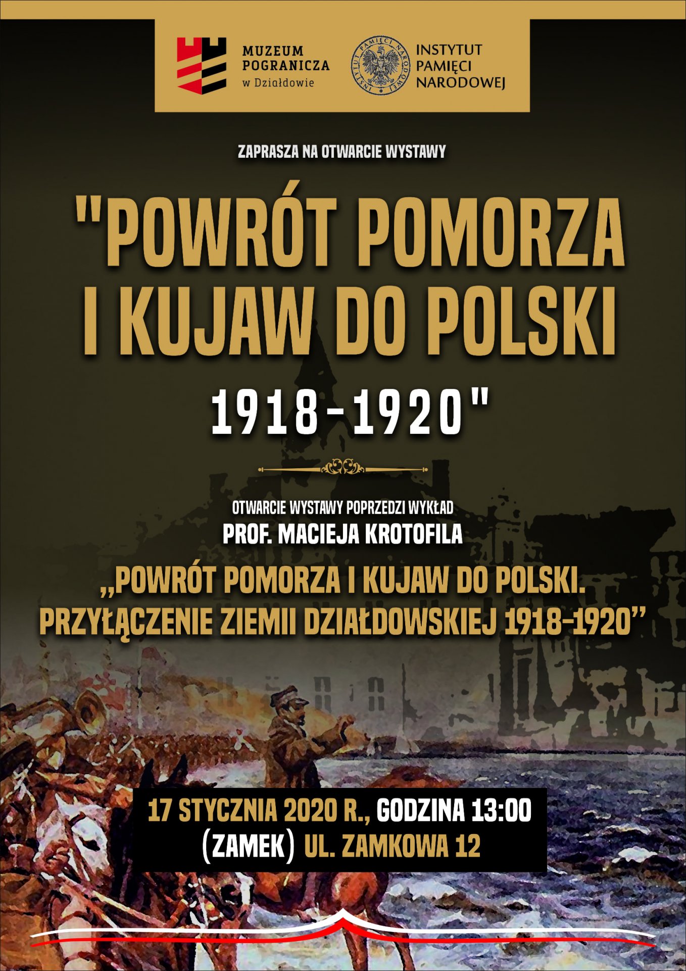 Muzeum Pogranicza w Działdowie oraz Instytut Pamięci Narodowej zapraszają na uroczyste otwarcie wystawy „Należy stworzyć niepodległe państwo polskie (…) z wolnym dostępem do morza. Powrót Pomorza i Kujaw do Polski 1918–1920”, które odbędzie się w siedzibie Muzeum Pogranicza w Działdowie. Otwarcie poprzedzi wykład prof. dr hab. Macieja Krotofila pt. „Powrót Pomorza i Kujaw do Polski. Przyłączenie ziemi działdowskiej 1918–1920”.