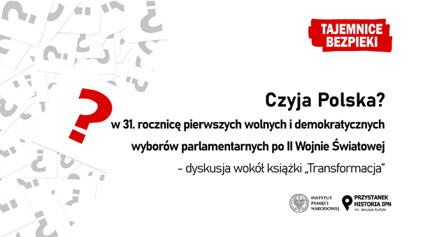 Instytut Pamięci Narodowej zaprasza na spotkanie otwarte „Czyja Polska? – w 31. rocznicę pierwszych wolnych i demokratycznych wyborów parlamentarnych po II Wojnie Światowej – dyskusja wokół książki „Transformacja” z cyklu „Tajemnice bezpieki”.